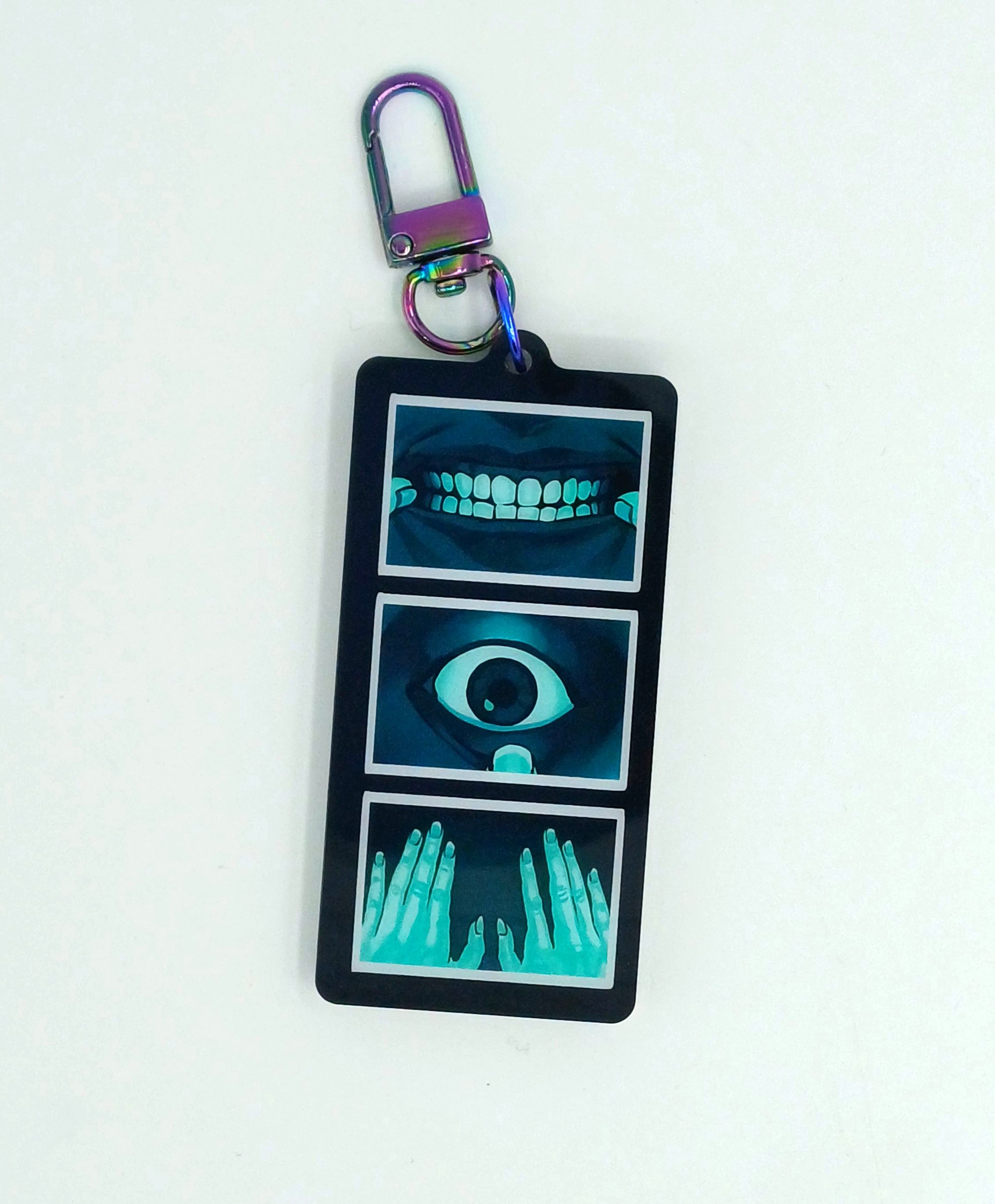 3-inch double-sided acrylic charm. Front side shows the moving eye and back side has static artwork!